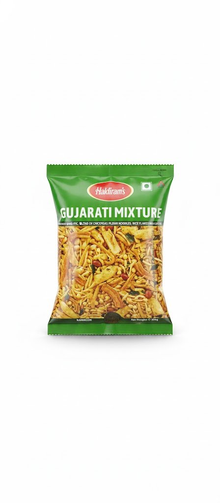 Haldiram’s Gujarati Mixture is a savory, sweet-and-spicy Indian snack mix featuring a crunchy blend of ingredients like rice flakes, corn flakes, peanuts, and gram flour sev.