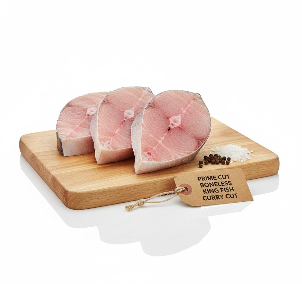 This 1 kg pack of boneless king fish curry cut is a premium, protein-rich seafood option with firm, fleshy meat, high omega-3 fatty acids, and a delicate flavor, perfect for curries or versatile cooking.