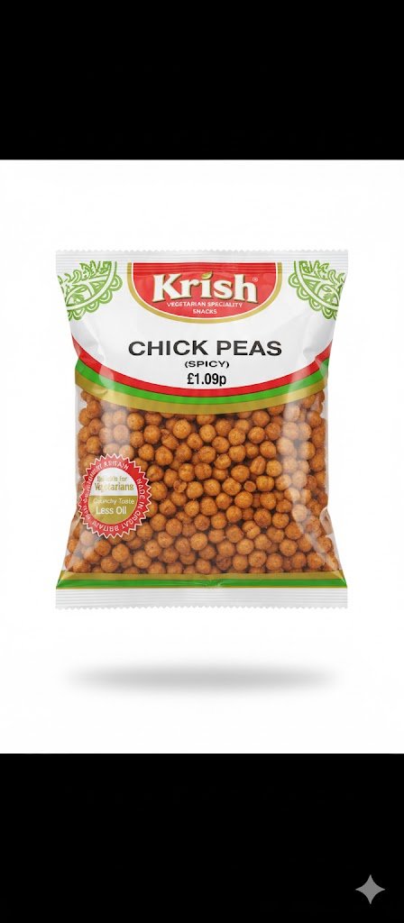 Krish Spicy Chick Peas are a crunchy, roasted snack made from chickpeas and seasoned with a bold blend of spices for a zesty, spicy flavor