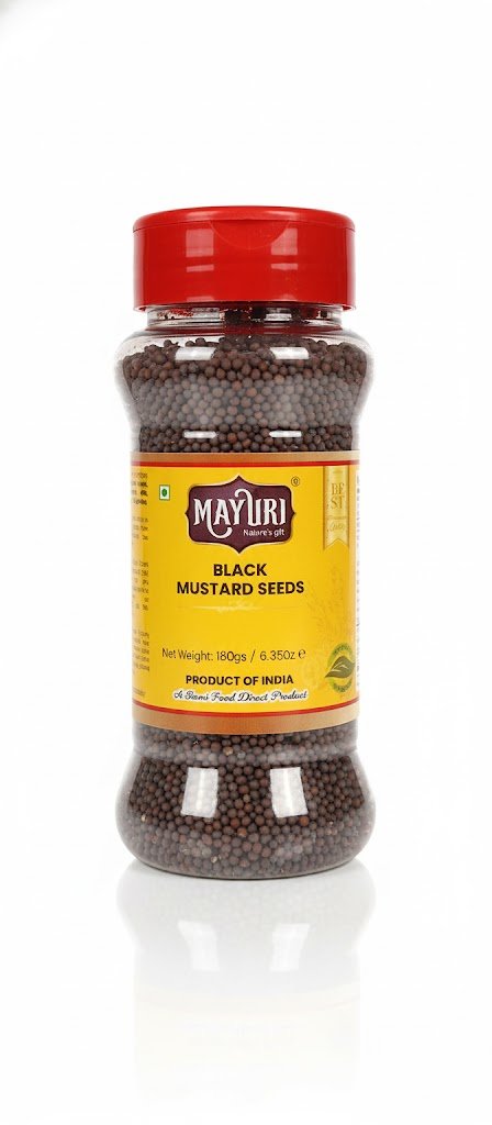 Mayuri Black Mustard Seeds (180gm) is a product featuring whole black mustard seeds, a staple spice in Indian and global cuisines known for their pungent, sharp, and aromatic flavour when used in cooking