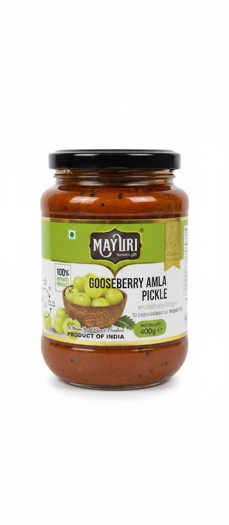 Mayuri Gooseberry Amla Pickle 400gm is a traditional Indian condiment that combines the natural tangy, sour, and slightly bitter taste of Indian Gooseberries (Amla) with a spicy and aromatic blend of authentic Indian spices