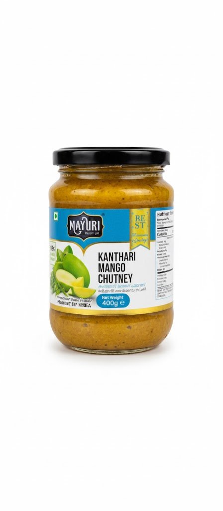 Mayuri Kanthari Mango Chutney is a 400gm jar of spicy South Indian chutney made from sun-ripened mangoes and bird’s eye chilies (kanthari mulaku)