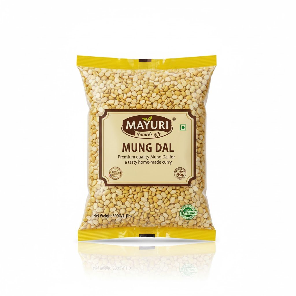 Mayuri Mung Dal – 500gm” is the brand name and packaging size for split and hulled mung beans (also known as yellow moong dal). This product is known for its high protein content, easy digestibility, and quick cooking time