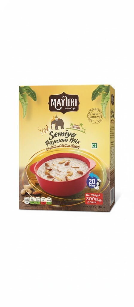 The Mayuri Semiya Payasam Mix (300gm) is an instant dessert mix designed to create traditional South Indian semiya payasam (vermicelli kheer) quickly and easily at home. It is a vegetarian product that contains a blend of high-quality, pre-roasted ingredients