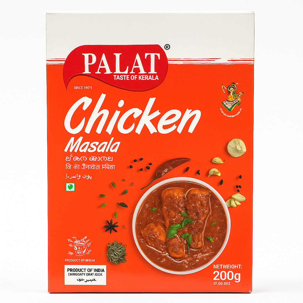 Palat Chicken Masala is a 200G traditional spice blend for aromatic chicken curry, with a 12-month shelf life, made in India, and is suitable for all cities. It is a mixture of clean, dried and sound aromatic herbs and spices.