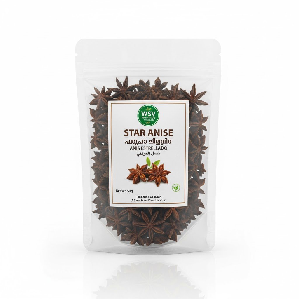Elevate your culinary creations with our premium, 100% natural Star Anise (Illicium verum). Sourced directly from the lush Western Ghats region, these exquisite, rust-coloured, star-shaped pods are carefully sun-dried to lock in their potent aroma and delicate flavour.